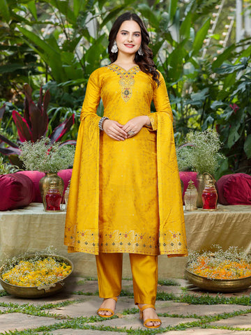 Flaunt the amazing yellow color of this suit in your upcoming festivities. The divine and...