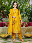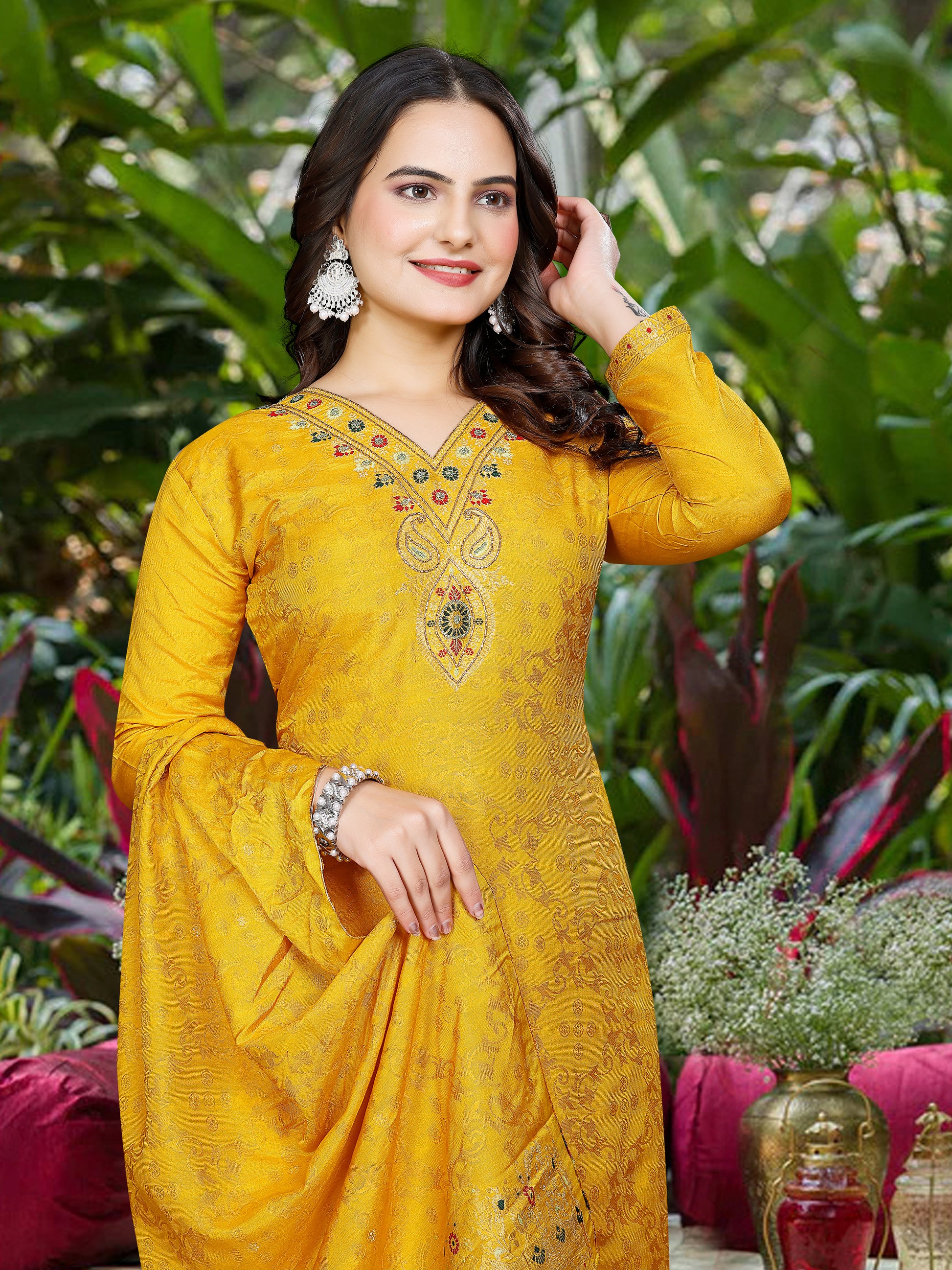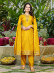 Flaunt the amazing yellow color of this suit in your upcoming festivities. The divine and luxurious fabric with weaving zari gives it elegant look. It is decorated with cutdaana hand work and premium mirror works🌿